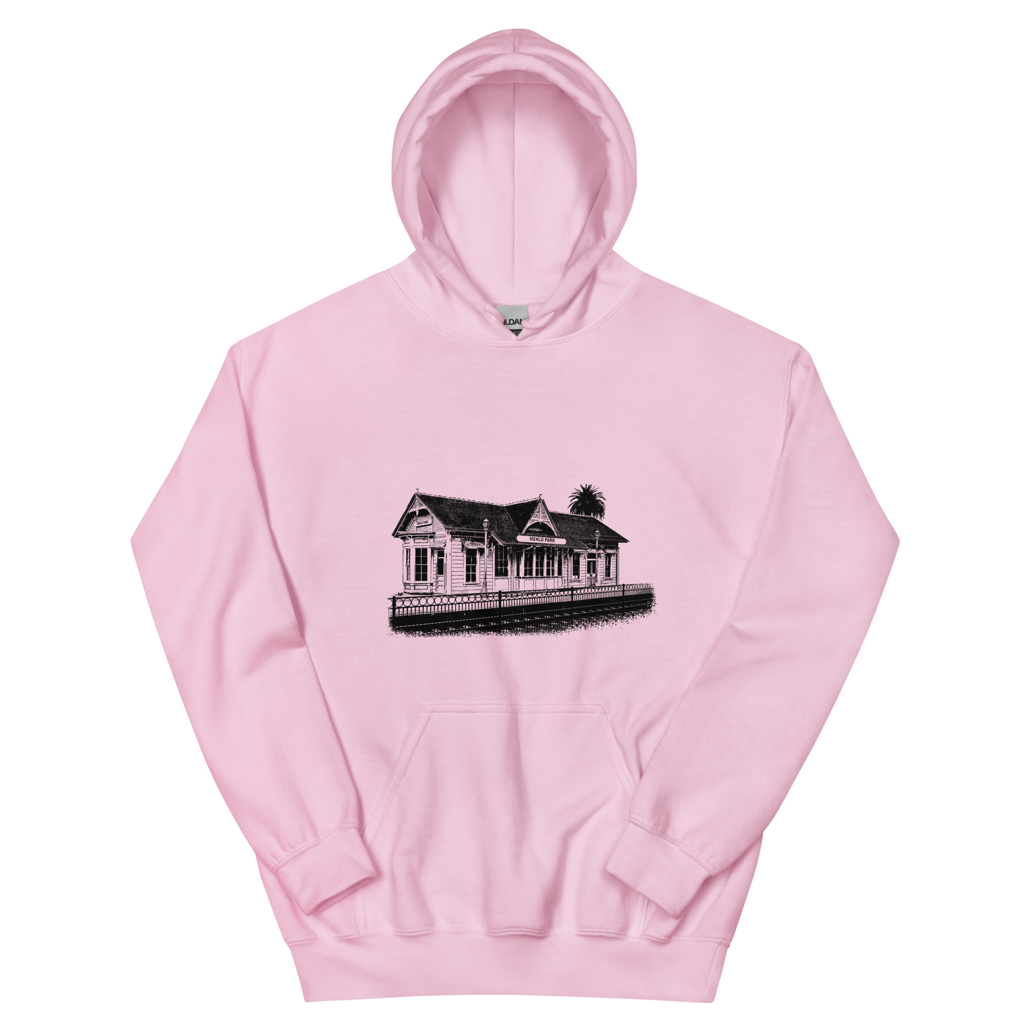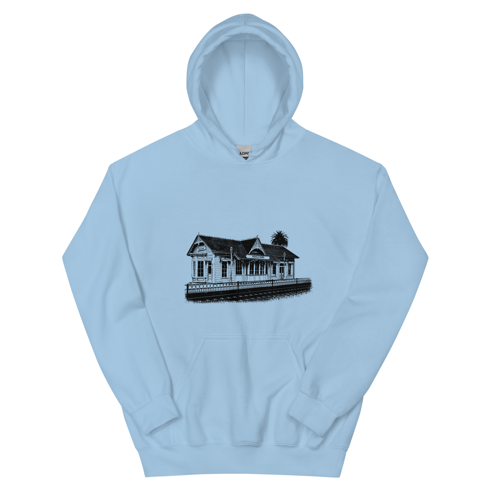 The historic Menlo Park Train Depot is beautiful and sure to look good on you! Part of our architectural series, this hooded sweatshirt is sylish and comfortable for both men and women!