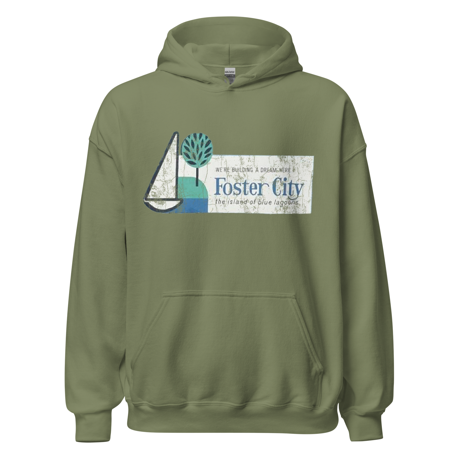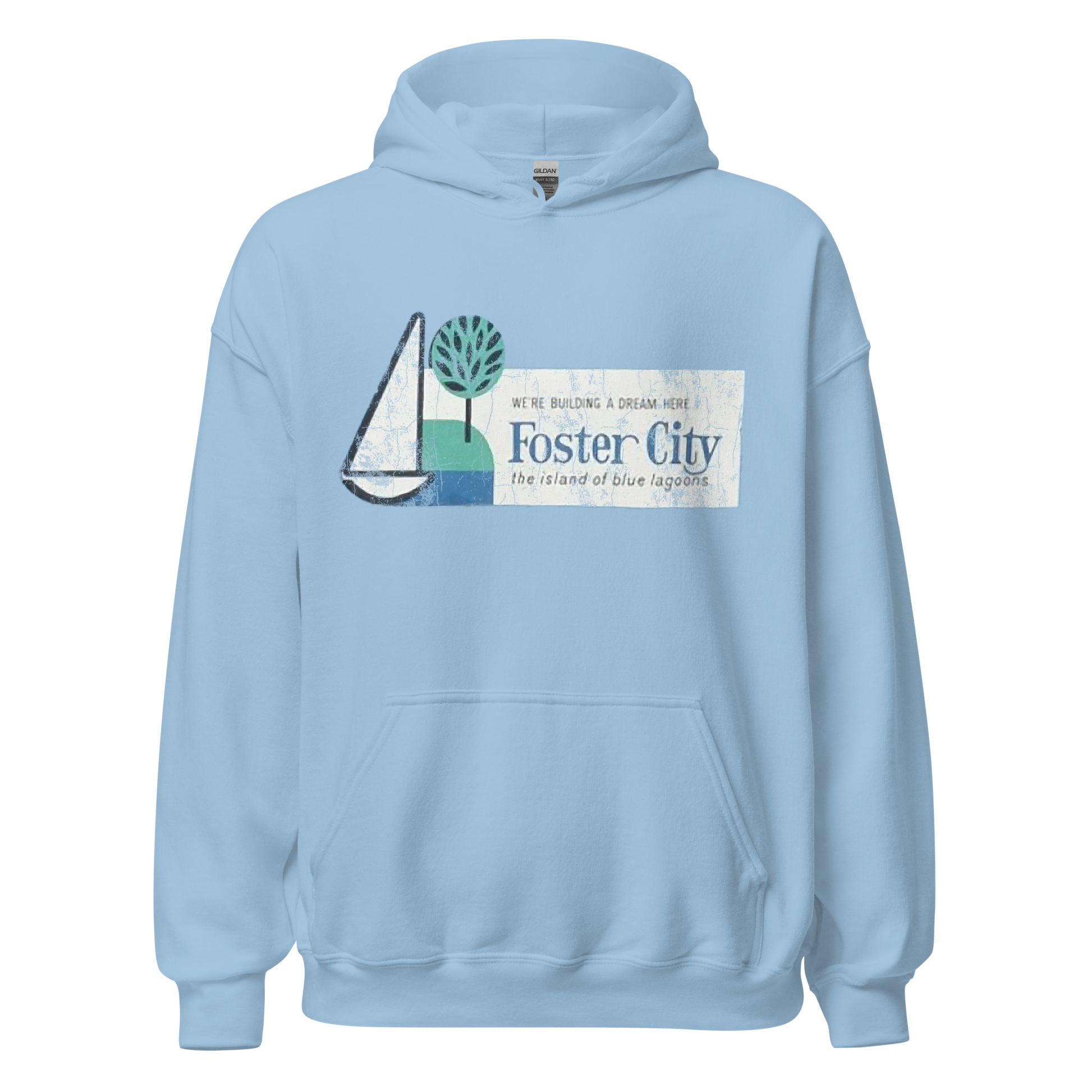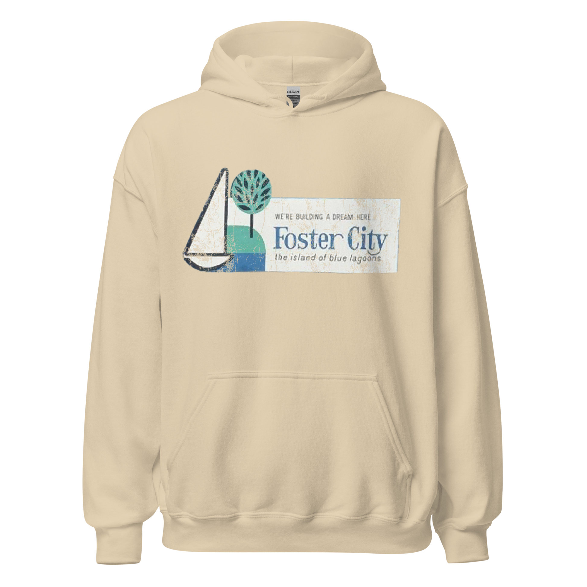 Foster City was an easy sale for homebuyers in the Bay Area, a planned community on the waterways of the San Francisco Bay! Wear the original sales billboard on a soft hoodie for men or women! Perfect for those breezy Bay Area evenings!