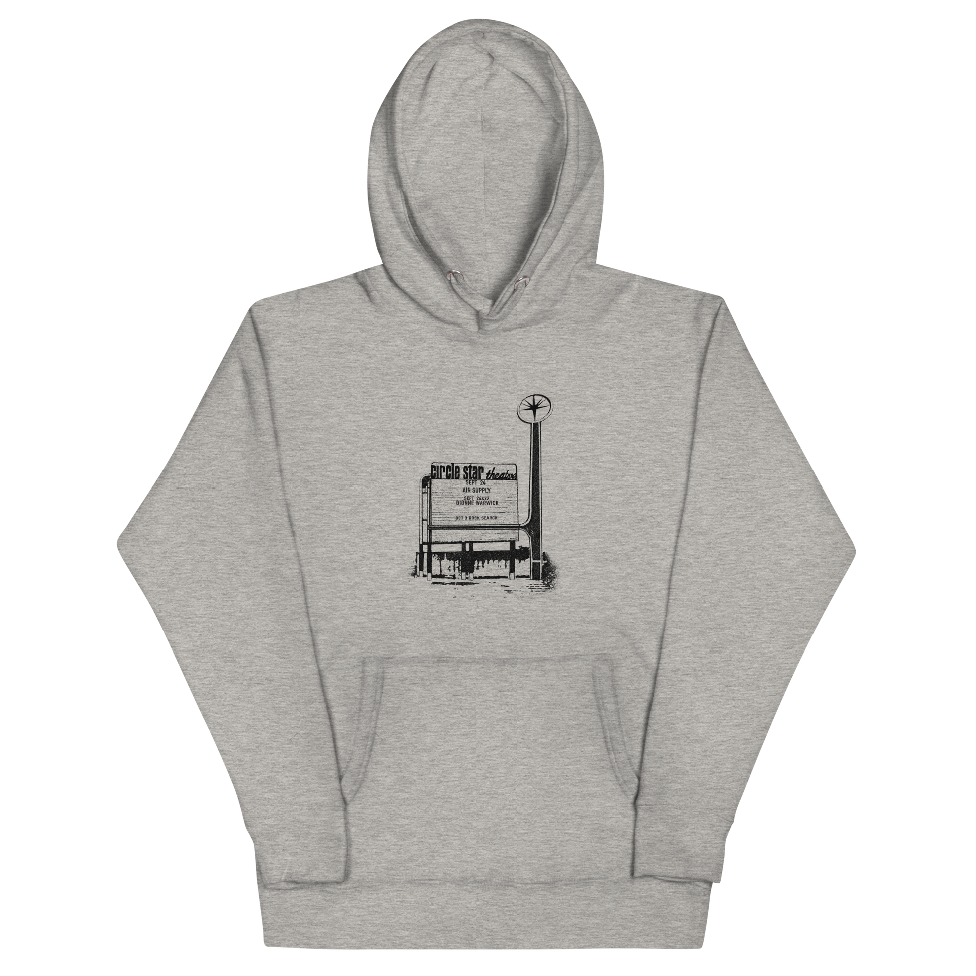 The world famous Circle Star Theatre! You'll love this hoodie from our local old school architectural series! Front pocket, soft and warm! • 100% cotton face • 65% ring-spun cotton, 35% polyester • Front pouch pocket • Self-fabric patch on the back • Matching flat drawstrings • 3-panel hood Disclaimer: This hoodie runs small. For the perfect fit, we recommend ordering one size larger than your usual size. -